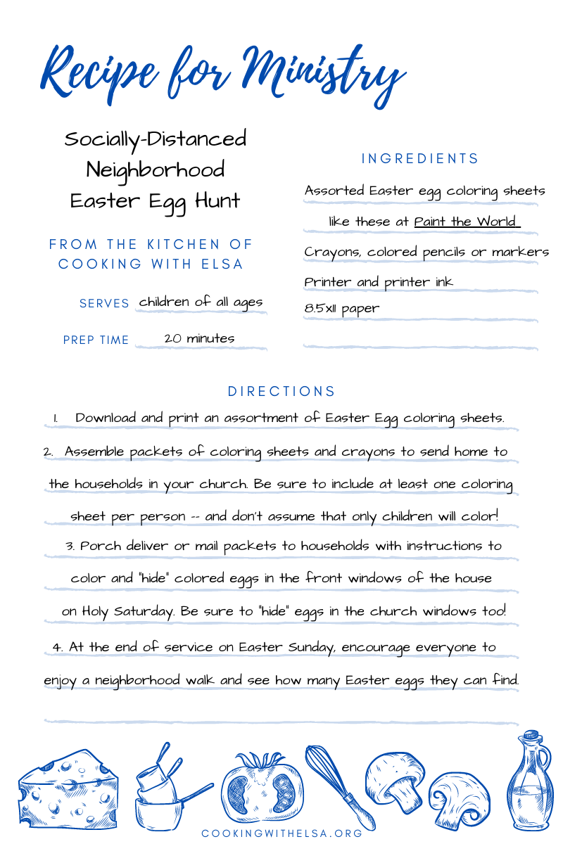 If you have a congregation that is geographically disperse, this might be more complicated. It might take more than 20 minutes but it may also be worth the extra time to focus your egg hunt in one neighborhood where there are the most church members. If you opt for this, you will need to encourage masks and social distancing especially if the entire congregation will drive to that neighborhood after church. Even with the vaccine slowly rolling out, there isn’t a place in our country where it is possible to skip these precautions. You’d have to insure there’s ample parking too which sounds frustrating but maybe there are businesses downtown that would be willing to display eggs. Or maybe there is another possibility I’m not imagining.