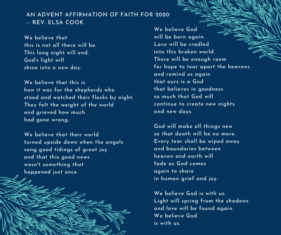 > Elsa Anders Cook posted: ” I wanted to write a statement about what it > means to be a person of faith when everything feels uncertain for the > service I wrote for the Longest Night in 2020. I did it partially for > myself. I needed words to speak to what I believe right now, but I” >